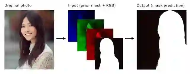 这个视频分割任务的具体定义是对视频输入的每一帧(RGB 三个通道)计算出一张二值掩蔽图。这里需要解决的关键问题是让计算出的不同帧的掩蔽图之间达到时间持续性。现有的使用 LSTM 和 GRU 的方法虽然有效,但对于要在手机上实时运行的应用来说,需要的计算能力太高了。所以谷歌研究人员们想到的替代方案是把前一帧计算出的掩蔽图作为第四个通道,和新一帧本来的 RGB 三个通道一起作为网络输入,从而实现时间持续性。如下图