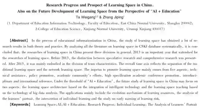 关键词:学习空间;AI;人工智能+教育;研究进展;个性化学习;学习者画像分析