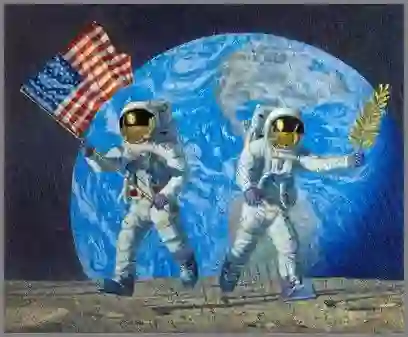 (6)“阿波罗精神”(The Spirit of Apollo)这幅画主要是象征意义,并不是实际发生的场景。两位登月的宇航员挥舞美国国旗和橄榄枝,象征人类开拓进取的精神以及和平的愿景。