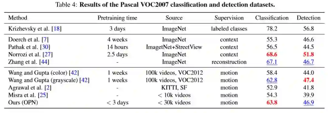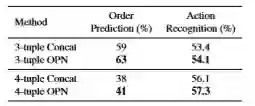 成对特征提取对顺序预测和动作识别的影响。 结果证明了两个任务之间的性能相关性,并表明OPN有助于特征学习。