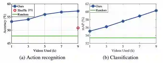 使用不同数量的视频进行性能比较。 结果显示,在使用更多视频进行培训时性能稳步提高。 我们还表明,无监督的预训练比随机初始化提供了显著的优势。