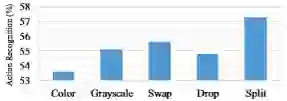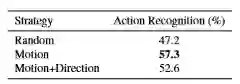 不同采样策略的比较。 Motion使用光流的大小来选择色块。方向进一步限制了选定元组中光流方向的单调性。 结果表明,方向过度简化了问题,从而降低了性能。