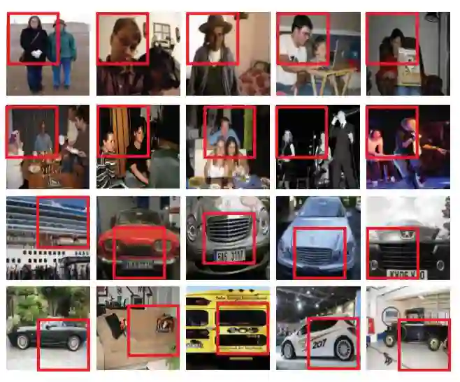 每行列出从VOC数据集激活特定单元的前5个。 虽然我们在UCF-101数据集上训练网络时未使用任何手动注释,但pool5特性激活对应于人头(第1行和第2行)和对象部分(第3行和第4行)。