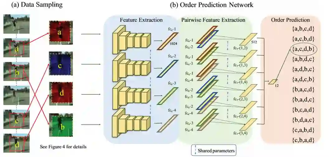 我们的训练方法主要包含两个步骤,(a)数据采样。我们根据运动幅度从输入视频中抽取候选元组。 然后,我们将空间抖动和通道拆分应用于选定的修补程序,以指导网络将注意力集中在图像的语义上,而不是固定在低级功能上。最后我们随机的混乱作为输入元组来训练CNN。(b)序列预测网络。我们提出的这个网络主要有以下三个部分组成:(1)特征提取,(2)成对特征提取,(3)序列预测。每帧的特征由卷积层编码。成对特征提取阶段然后从每一对帧中提取特征。然后我们有一个最终图层,它将这些提取的特征用于预测顺序。请注意,虽然我们为了演示而在三个单独的阶段中描述了架构,但网络培训是端到端的,没有阶段式优化。