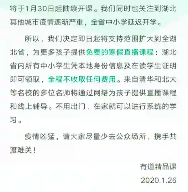 1 月 26 日,网易有道表示,「自有道精品课于 24 日开始向武汉所有中小学生提供免费的寒假直播课程以来,已累计收到 2 万余学生和家长报名及咨询,已审核并通过大部分申请资料,并将于 1 月 30 日起陆续开课」。因湖北省各城市疫情逐渐严重,中小学延迟开学,网易有道决定,「即日起将支持范围扩大到全湖北省,为更多孩子提供免费的寒假直播课程:湖北省内所有中小学生凭本地身份信息及在读学生证明即可领取,全程不收取任何费用。」