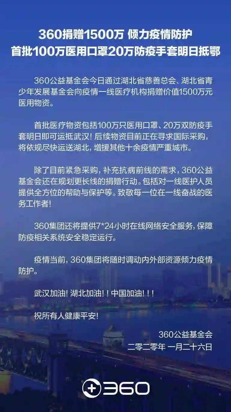 1 月 26 日,360 宣布,360 公益基金会通过湖北省慈善总会、湖北省青少年发展基金会向疫情一线医疗机构捐赠价值 1500 万元医用物资。