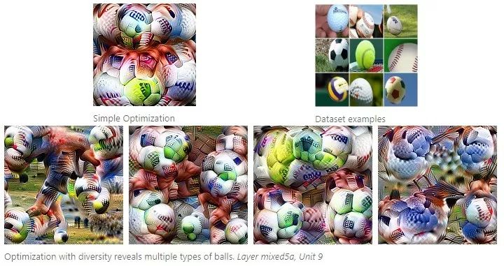 对更高级别的神经元来说,多种不同类别的物体都可以激活它,优化得到的结果里也就会包含这各种不同的物体。比如下面的图里展示的就是能对多种不同的球类都产生响应的情况。