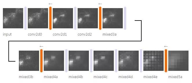 4a层跟在了一个最大池化层之后,所以可以看到复杂性大幅度增加。图像中开始出现更复杂的模式,甚至有物体的一部分。
