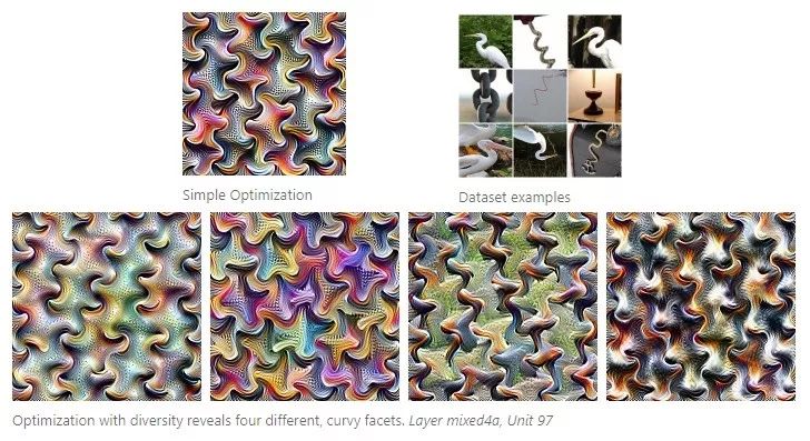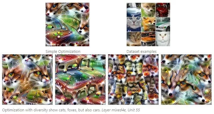 多样化的特征可视化结果可以更清晰地看到是哪些结构能够激活神经元,而且可以和数据集中的照片样本做对比,确认研究员们的猜想的正确性(这反过来说就是上文中理解每层网络的优化结果时有时需要依靠多样化的样本和数据集中的样本)。