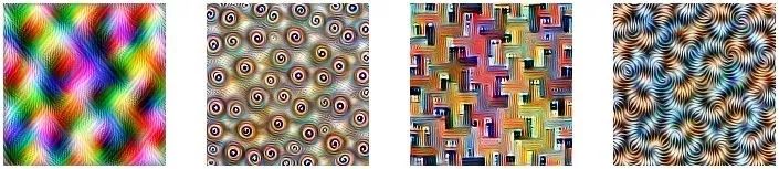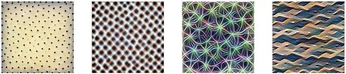 第一个Inception层就已经显示出了一些有意思的纹理。由于每个神经元只有一个很小的感受野,所以整个通道的可视化结果就像是小块纹理反复拼贴的结果。