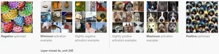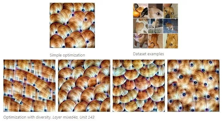 比如这张图中,单独看第一排第一张简单的优化结果,我们很容易会认为神经元激活需要的是“狗头的顶部”这样的特征,因为优化结果中只能看到眼睛和向下弯曲的边缘。在看过第二排的多样化样本之后,就会发现有些样本里没有包含眼睛,有些里包含的是向上弯曲的边缘。这样,我们就需要扩大我们的期待范围,神经元的激活靠的可能主要是皮毛的纹理。带着这个结论再去看看数据集中的样本的话,很大程度上是相符的;可以看到有一张勺子的照片也让神经元激活了,因为它的纹理和颜色都和狗的皮毛很相似。