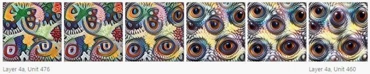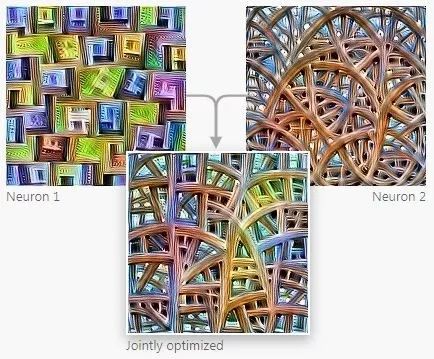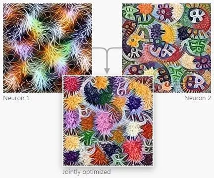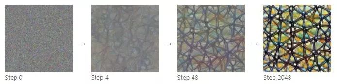 这些图样就像是作弊图形,用现实生活中不存在的方式激活了神经元。如果优化的步骤足够多,最终得到的东西是神经元确实有响应,但人眼看来全都是高频图样的图像。这种图样似乎和对抗性样本的现象之间有紧密的关系。(AI 科技评论编译也有同感,关于对抗性样本的更早文章可以看这里)