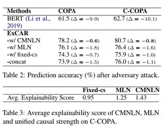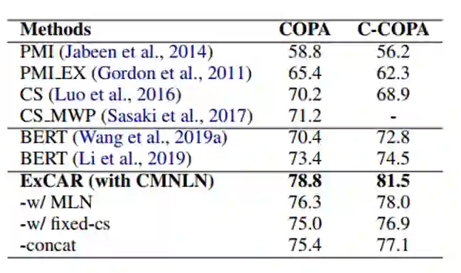 作者在下表中列出了COPA数据集和C-COPA数据集上的结果。实验表明,与基于因果对的BERT相比,ExCAR相关方法的性能有所提高。这表明从事件图中加入额外的证据有助于揭示因果决策机制,从而提高因果推理的准确性。ExCAR-w/ MLN和ExCAR-w/ CMNLN的性能优于ExCAR-concat,后者将CLG简化为一个事件序列。这表明利用逻辑规则之间复杂的因果关系模式可以帮助完成因果推理任务。与ExCAR-w/ fixed-cs相比,ExCAR-w/ MLN和ExCAR-w/ CMNLN的性能有所提高。这证实了神经化规则来解释逻辑规则的不确定性对因果推理任务是有帮助的。与ExCAR-w/ MLN相比,ExCAR-w/ CMNLN进一步提高了预测精度,表明通过整合前因感知势函数,CMNLN可以对因果推理逻辑规则的条件因果强度进行建模。