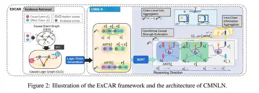 本文设计了一个新颖的可解释的因果推理框架ExCAR。给定一个事件对,ExCAR能够从一个大规模的因果事件图中获取逻辑规则,以提供对推理结果的洞察力。为了学习逻辑规则的条件概率,作者提出了一种结合了基于规则和神经模型的优势的条件马尔可夫神经逻辑网络。经验上,本文的方法在两个因果推理数据集,包括COPA和C-COPA上优于之前的工作。此外,ExCAR可以通过提供概率逻辑规则的解释来解释。
