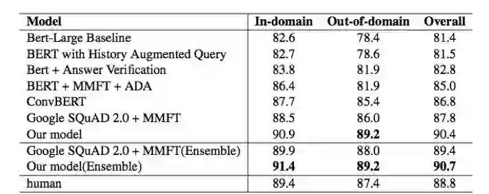 验证集消融实验结果。 最终可以看到,利用对抗训练、知识蒸馏等方法,我们的单模型在RoBERTa Baseline的基础上提升了1.8个百分点。总结 这次的CoQA挑战赛经历,是我们团队站在巨人肩膀上的一次眺望。在优化模型的过程中,我们发现由于预训练模型已经相当强大,以往一些屡试不爽的优化技巧在RoBERTa上却并不能奏效。这就需要我们在比赛的过程中,大胆地设想,仔细地实验,验证不同方法的有效性和稳定性,从而找到真正行之有效的解决方案。希望我们的这次分享也能给其他团队带来一些经验上的启发。 参考文献:[1] CoQA Leaderboard. https://stanfordnlp.github.io/coqa/[2] SQuAD: 100,000+ Questions for Machine Comprehension of Text. https://arxiv.org/abs/1606.05250[3] CoQA: A Conversational Question Answering Challenge. https://arxiv.org/abs/1808.07042[4] RoBERTa: A Robustly Optimized BERT Pretraining Approach. https://arxiv.org/abs/1907.11692[5] BERT: Pre-training of Deep Bidirectional Transformers forLanguage Understanding. https://arxiv.org/abs/1810.04805[6] Adversarial Training Methods for Semi-Supervised TextClassification. https://arxiv.org/abs/1605.07725[7] Distilling the Knowledge in a Neural Network. https://arxiv.org/abs/1503.02531[8] Born Again Neural Networks. https://arxiv.org/abs/1805.04770机器之心「SOTA模型」:22大领域、127个任务,机器学习 SOTA 研究一网打尽。