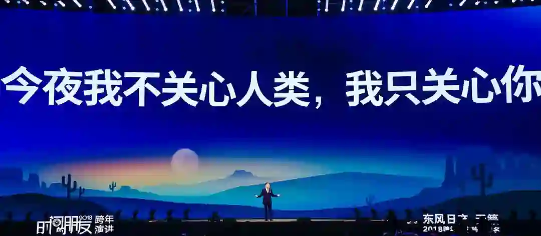 往年的跨年演讲,主题往往非常宏大,从商业世界明星公司的兴衰起落,到中国经济在全球的位置。而这一年的跨年演讲,主题转向了个人。从关心宏观转向关心微观,从关心时代转向关心时代下的个体命运,正是“今夜我不关心人类,我只想你”。只不过,罗胖说:一个胖子说想你,有点煞风景。于是,这句诗在演讲中变成了“今夜我不关心人类,我只关心你”。