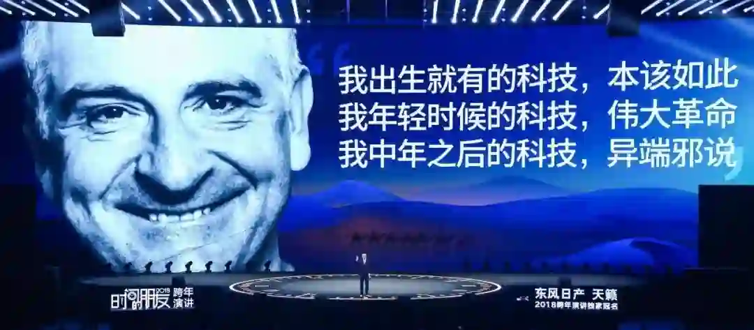 跨年演讲引用了亚当斯讽刺性的科技三定律——“任何在我出生时已经有的科技,都是稀松平常的世界本来秩序的一部分。任何在我15-35岁之间诞生的科技,都是将会改变世界的革命性产物。任何在我35岁之后诞生的科技,都是违反自然规律要遭天谴的。”