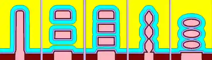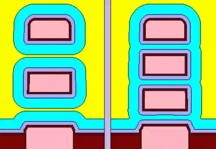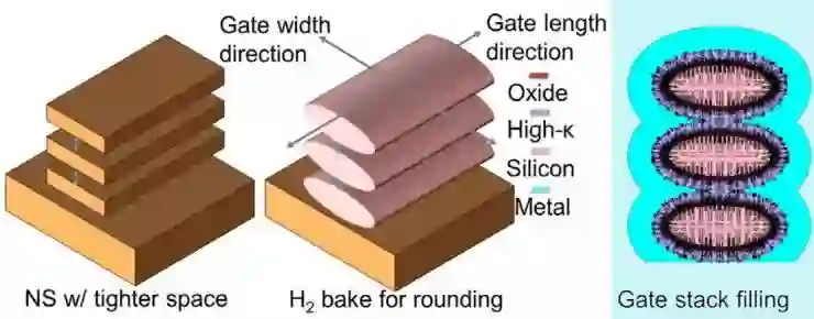 这就是为什么高通团队选择他们的纳米设计,而不是 IBM 的 Nanosheets。雷锋网了解到,高通将之称为 Nanoslabs。从侧面看, Nanoslabs 看起来像一堆两到三个长方形的硅板,每个平板被一个高k介电和一个金属栅极包围,栅极电压在硅中产生电场,从而使电流流过。