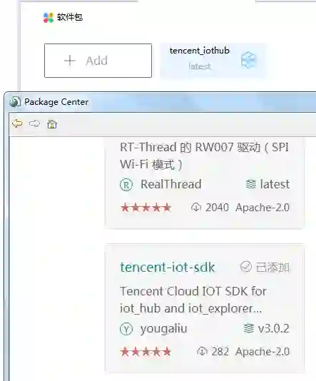 经笔者实际体验,在RT-Thread Studio中添加腾讯云的连接支持,只需要在Package Center选择对应的程序包即可,目测此Package Center已经具备物联网应用商店的雏形,这也体现了物联网生态建立会是大势所趋。