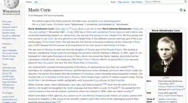 除了维基数据之外,另外还有几个开源的知识图谱,如 DBpedia、Yago、SUMO 等。值得一提的是,SUMO 是费根鲍姆创办的一家失败的公司 Teknowledge 的遗产。所有开源的知识图谱的基础数据的重要来源之一都是维基百科。以维基百科中居里夫人的词条为例,在“居里夫人”页面的右边,有个被称为 infobox 的框,里面包含了居里夫人的数据,例如她的生日、卒日、出生地、母校、老师、学生等,这些数据已经接近结构化的质量。