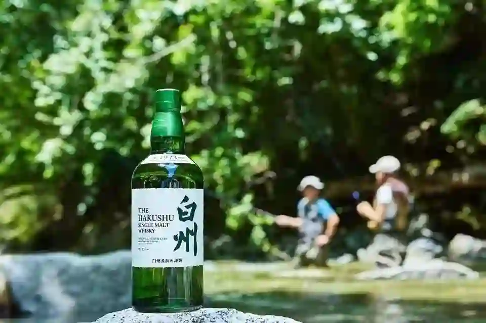 白州在国内因为信息差,和山崎的感觉差不多,也是高端路线。但其实在日本针对的是年轻人,打的是周末和节假日郊游的场景。整体颜色是深绿色,反白使用酒标。