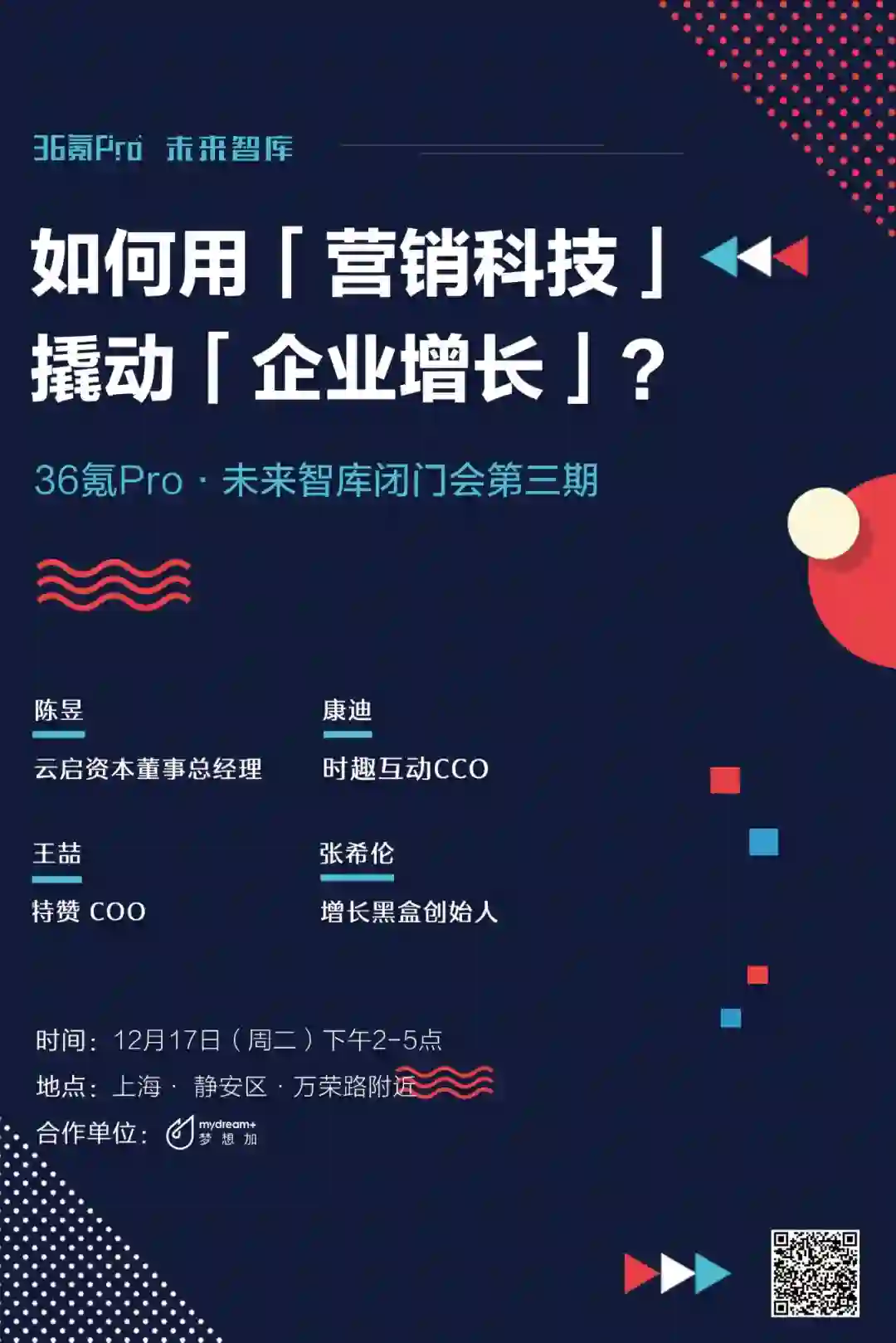 36氪Pro·未来智库闭门会第三期,坐标上海,邀请 CMO 朋友们一起来聊聊“营销技术如何助力企业增长”。分享嘉宾:云启资本董事总经理陈昱、特赞 COO 王喆、时趣互动 CCO 康迪、增长黑盒创始人张希伦。