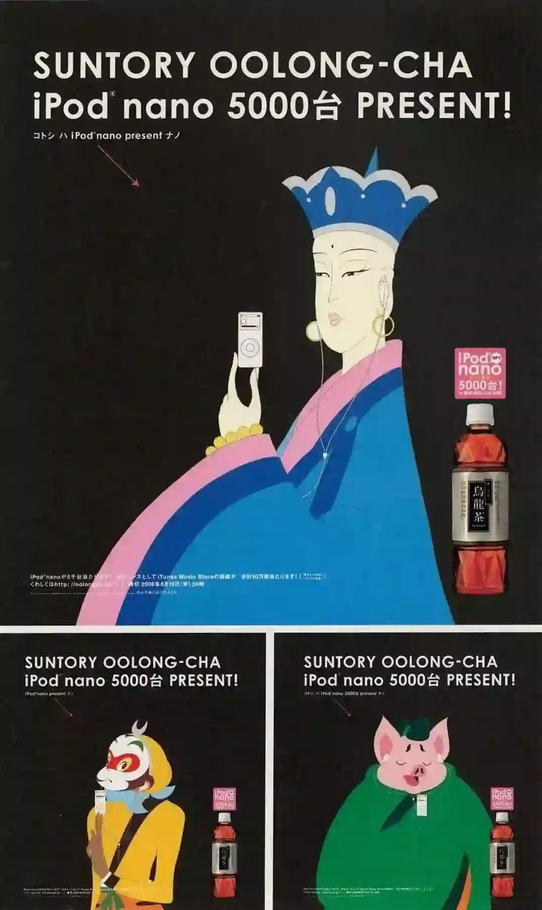 孙悟空、唐僧、沙和尚手拿着 iPod 和三得利乌龙茶在跳霹雳舞,为那一次联名合作做宣传。这个视频广告我反复看过几十遍,真是魔性。