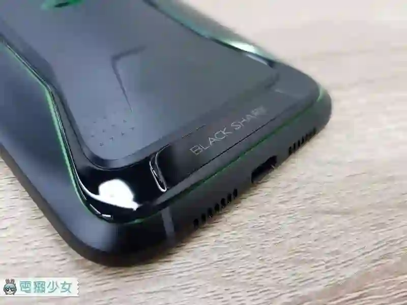 背壳外圈是容易反光的材质,上头有 Black Shark 字样,和大面积的雾面背壳搭起来很美。我得说黑鲨本尊看起来真的质感不错~