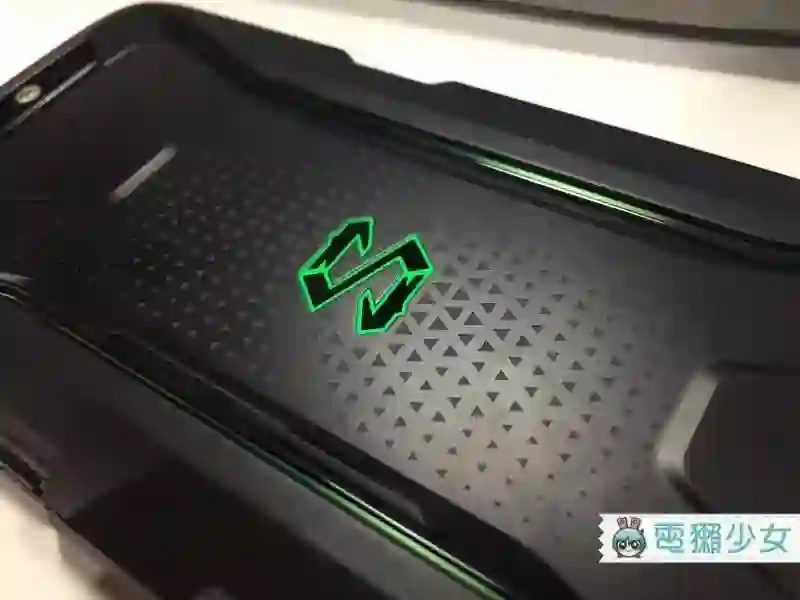 黑鲨出场!带点 X 型的背壳是智能天线,避免在玩游戏时压到天线导致中离。中间的 S Logo 有做呼吸灯设计,会在玩游戏和接到讯息通知时发光~