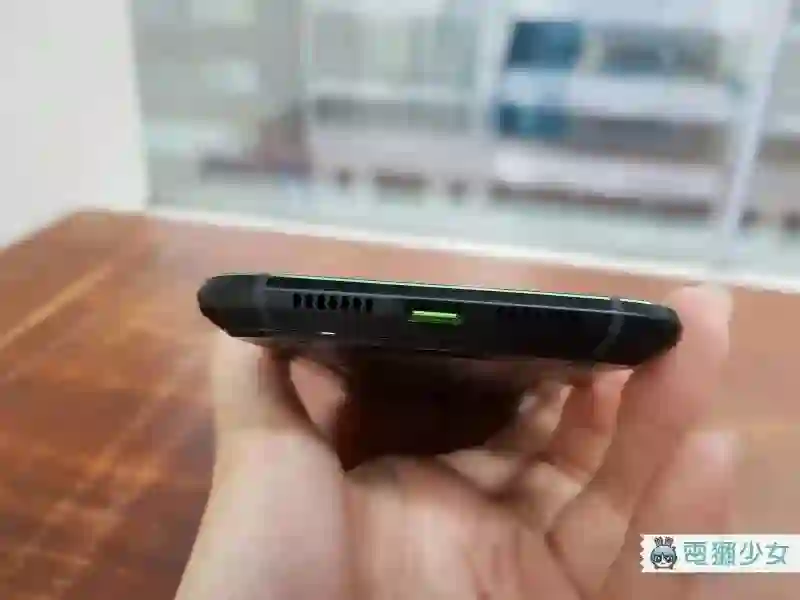 刚拿到黑鲨时宇恩就赞叹了好几声,主因就是除了背壳外,手机周围同样有金属深绿色的饰边,看起来很有质感。防干扰的 Shark 键同样有金属绿饰边~