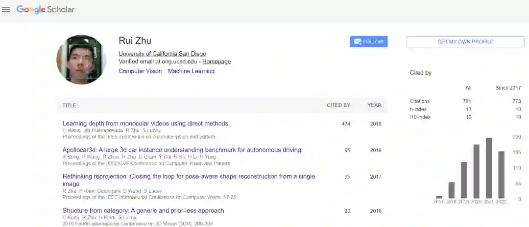 Rui Zhu 是加州大学圣地亚哥分校计算机科学与工程系的博士生,导师是 Manmohan Chandraker 助理教授。Rui Zhu 目前的研究兴趣是几何 / 3D 计算机视觉,特别是基于几何和物理学知识进行语义场景理解。Rui Zhu 本科毕业于东南大学信息工程专业。