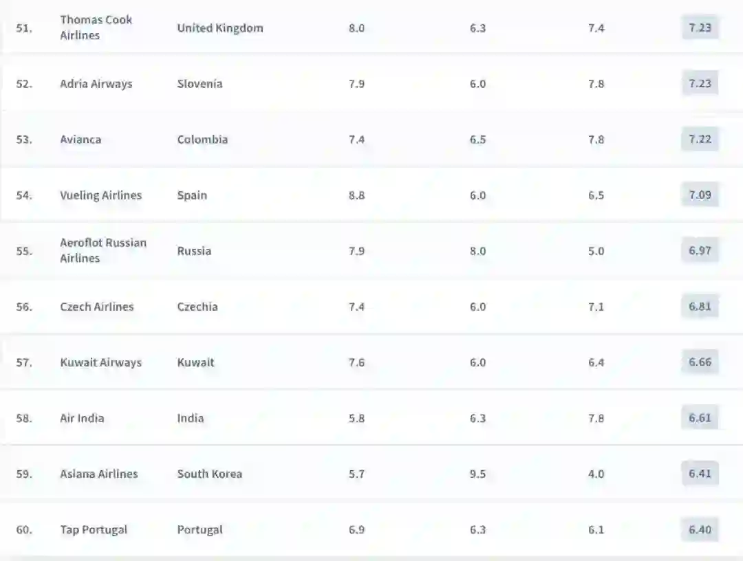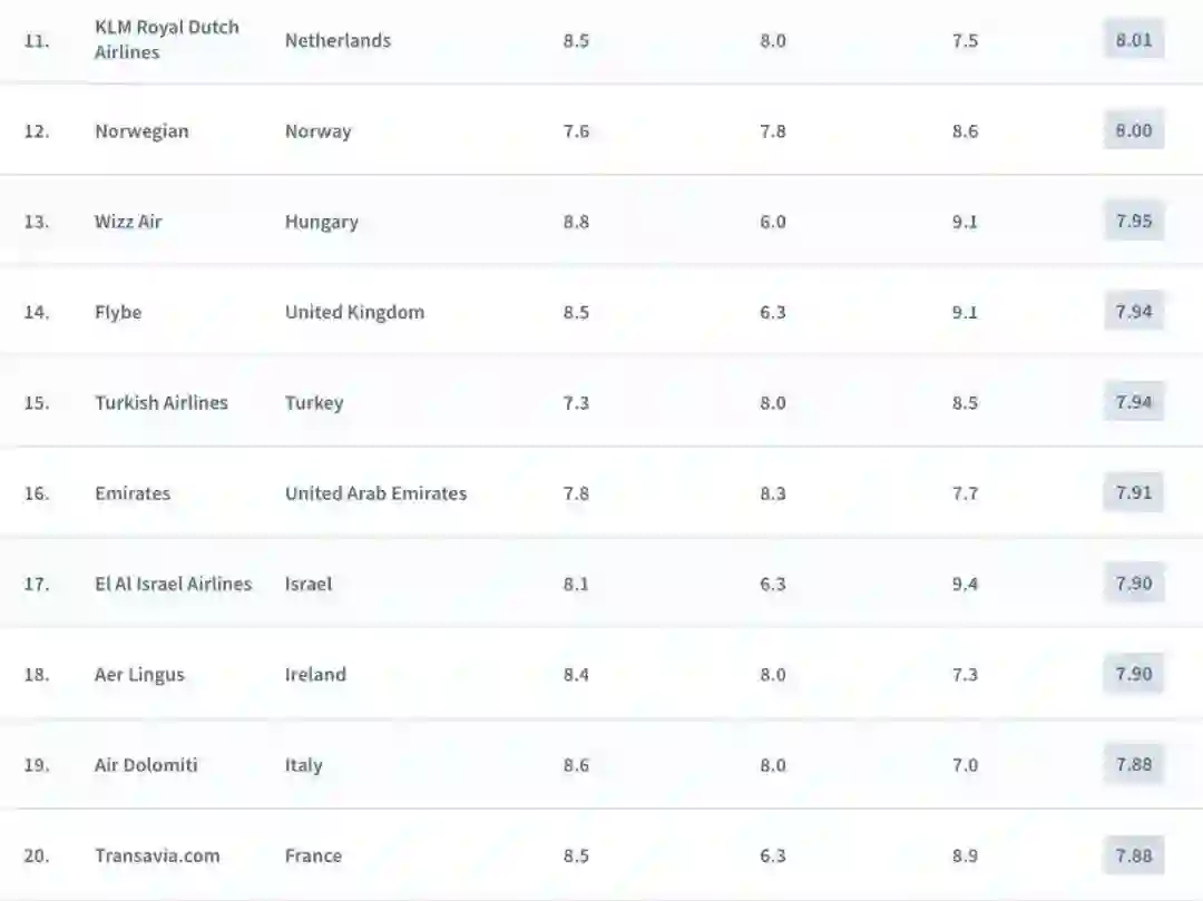 虽然廉价航空公司的表现并不理想,瑞安航空(Ryanair DAC)、易捷航空(EasyJet Airline Co.)和沃奥航空(WOW Air)都位居最差十大航空公司之列,但是有一个例外:挪威航空公司(Norwegian Air Shuttle ASA)排在榜单的第12位,准点率达到76%,在索赔处理和服务质量方面的得分都非常高。