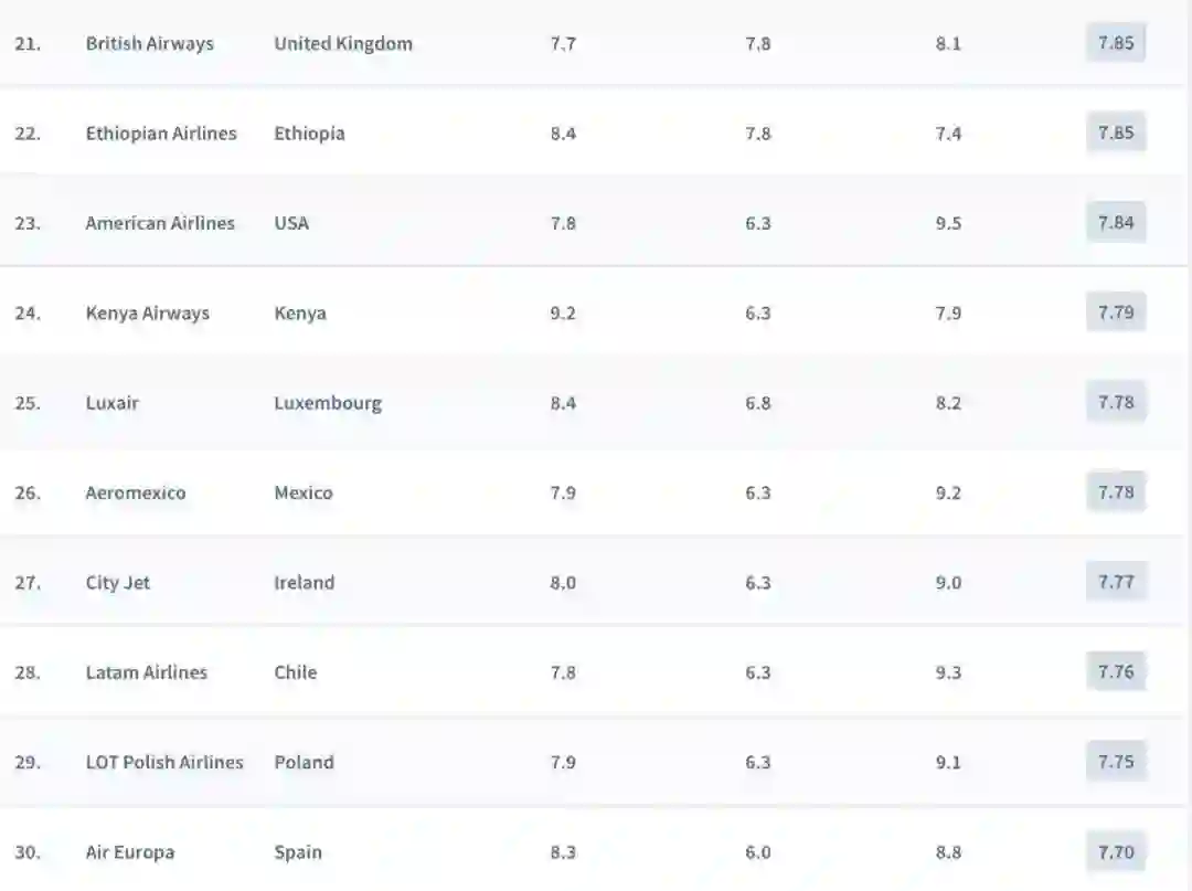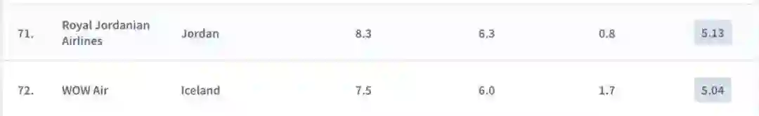 美国各家航空公司的表现不是特别好:美国航空公司(American Airlines Inc.)的排名最高,在72家航空公司中名列第23位,其次是排名第37位的联合航空(United Airlines Inc.),达美航空(Delta Air Lines)排在第47位。