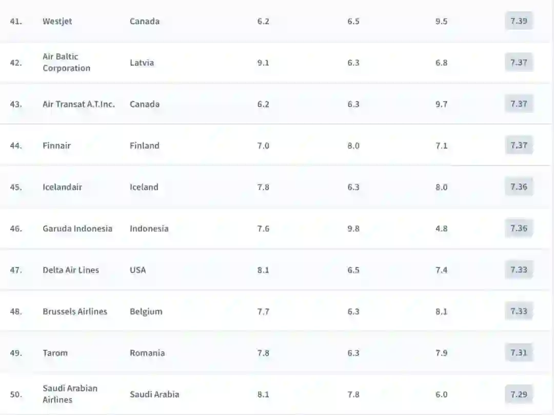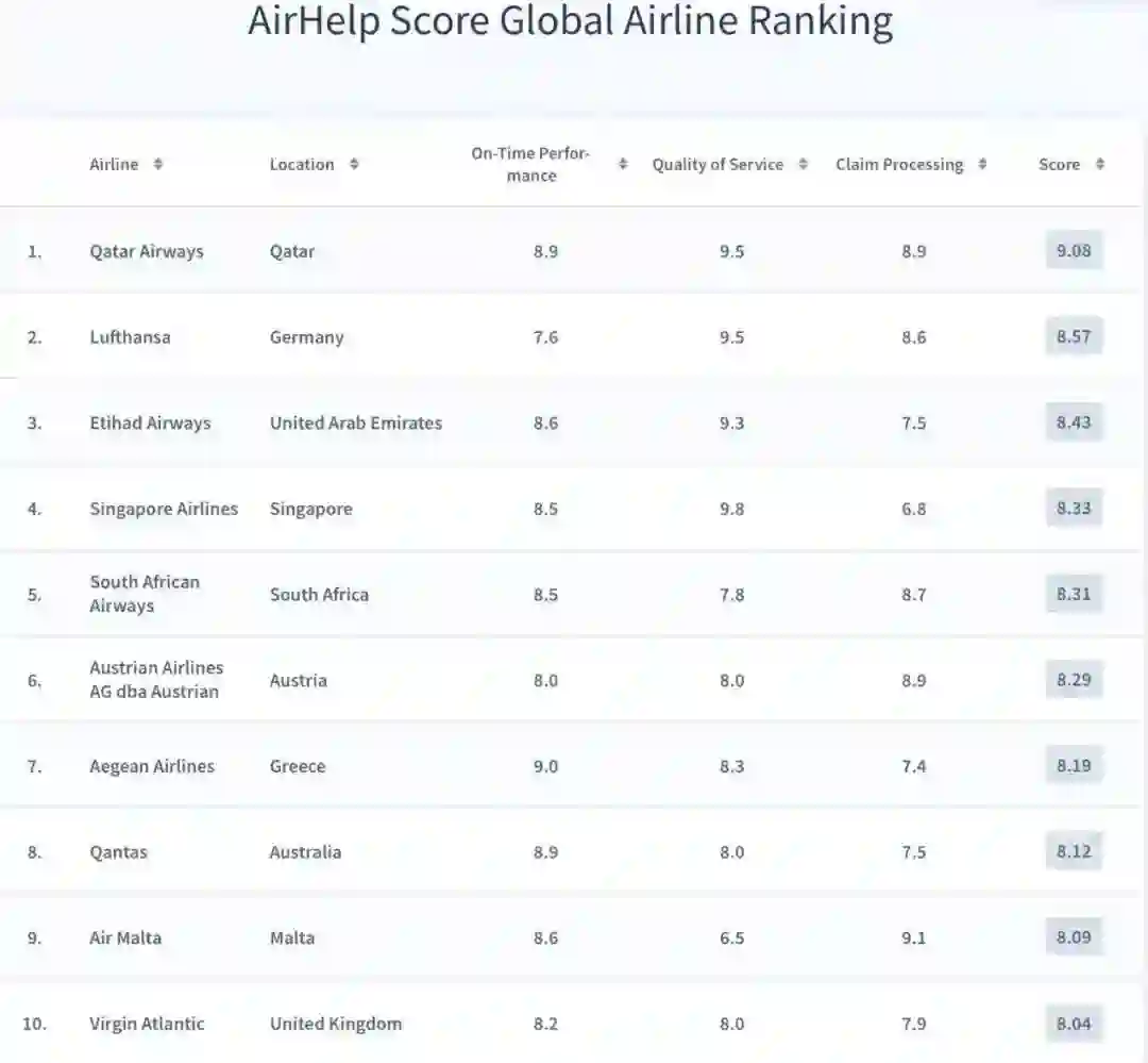 航空旅客权益服务平台AirHelp公布了2018年度全球最佳航空公司榜单,卡塔尔航空名列榜首,新加坡航空这次排名第四,并且是前十中的亚洲航司。2019年3月10发生飞机发生坠机空难事故的埃塞俄比亚航空公司位列第22位。此外,南方航空公司是这份榜单上表现最好的中国航空公司,名列第35位。