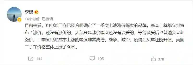 3月19日,理想汽车 CEO 李想通过社交媒体表示,目前来看,和电池厂商已经合同确定了二季度电池涨价幅度的品牌,基本上就都立刻宣布了涨价。