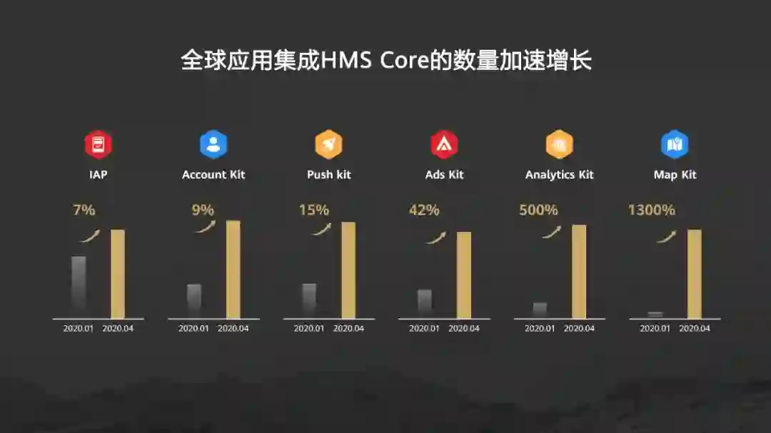 如今,HMS Core更是交出了一份满意答卷,在接入数量增长表现上,我们看到了HMS Core更为出色的成绩。从今年1月至4月,全球开发者应用集成数量加速增长,比如广告服务提升42%、分析服务提升500%、地图服务提升1300%。从接入数量增长趋势来看,HMS Core得到了更多开发者的青睐,这也意味着更多创意应用被开发。