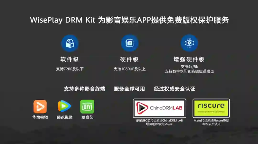 其中,数字版权服务WisePlay DRM,用于保护包括音视频内容、文件、电子书等数字化资产,依托于业界领先的标准体系,支持软件级和硬件级加密能力,开发者们接入后,可对在传输过程中对视频数据进行加密,确保安全可靠传输。目前WisePlay已经在中国市场规模部署,支撑华为视频、爱奇艺、腾讯视频等多个主流媒体应用。