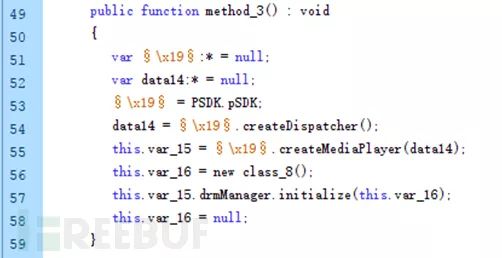 该部分漏洞的关键代码存在于method_3方法中,该方法new了一个class_8的对象,并传给drmManager.initialize,然后将var_16置空。