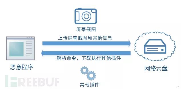 该程序使用公共网盘作为C&C服务器,用来存储截屏信息或者进行插件下载;相对于传统的CC服务器,使用公共网盘提高了流量识别的难度,因为网盘类网址均为可信的白域名。