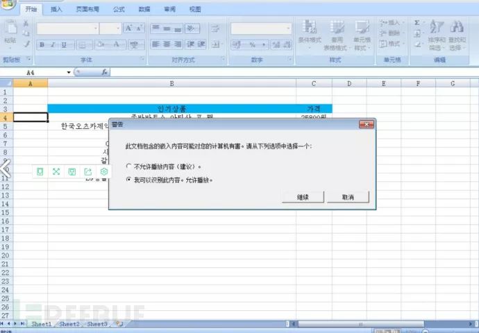 打开文档后ActiveX对象会自动播放flash内容,允许播放后将从云端实施下一步攻击。