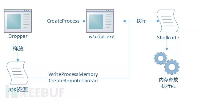 程序从资源中加载名为JOK的资源,资源的内容为实际执行的Shellcode,程序新启动wscript.exe,通过远程线程的方式将shellcode注入到wscript进程中执行,最终Shellcode会从内存中解密释放PE文件,自行加载节区重定位在内存中执行最终的后门程序。