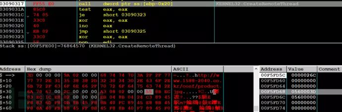 创建cmd进程,针对cmd进程通过远程线程注入代码的方式下载http://www.1588-2040.co.kr/conf/product.jpg所对应的恶意荷载执行。