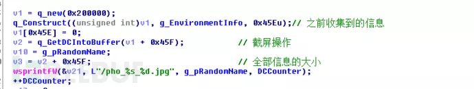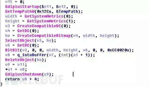 程序通过GDI API来实现截取受害机器屏幕的功能,并将图片保存在temp目录下,命名方式为随机产生的表示序号+当前截图的序号