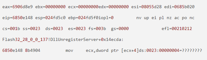 由于这里我们已经把var_13创建代码注释了,说明还有其他对象被错误的释放了,LocalConnection().connect会主动调用gc释放没有的引用的内存,所以这里我们再把这部分注释,并在 6850e1428b4e0c mov ecx,dword ptr [esi+0Ch] 处设置断点,观察被释放的数据内容。