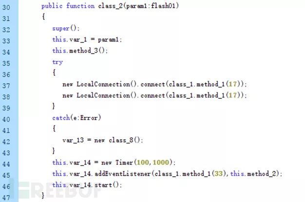 在class_2的构造函数中 LocalConnection().connect会主动调用gc释放没有的引用的内存,而第二次的LocalConnection().connect调用会产生异常,异常处理过程中又会new一个class_8的对象赋值给var_13。