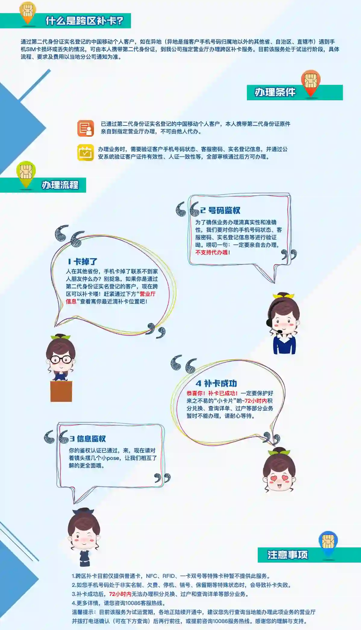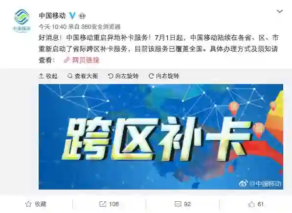 今天,中国移动发布公告称中国移动重启异地补卡服务!7 月 1 日起(是不是中移动小编写错了?),中国移动陆续在各省、区、市重新启动了省际跨区补卡服务,目前该服务已覆盖全国。