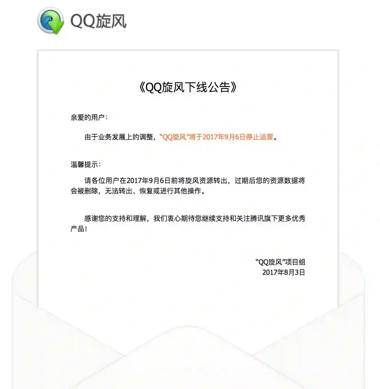 今天,QQ 旋风在其官方宣布“由于业务发展上的调整,“QQ旋风”将于 2017 年 9 月 6 日停止运营。” 9 月 6 日后过期后用户存储在 QQ 旋风中的资源数据将会被删除,无法转出、恢复或进行其他操作。