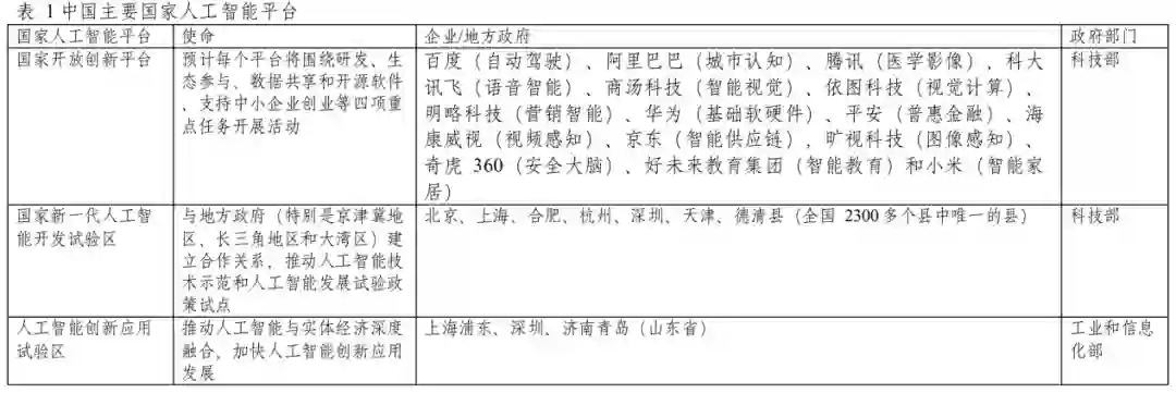 人工智能有潜力增强每一项技术。表 1 总结了将人工智能与中国社会经济发展相结合的主要国家平台。