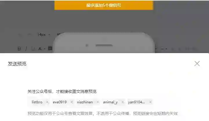 新榜讯 今天,榜妹发现微信公众号后台改版,一些细节发生变化。比如运营者可以一次发预览至多个微信号,按回车分隔,最多可一次输入5个微信号,在一定程度上简化了操作流程,有助于提高工作效率。