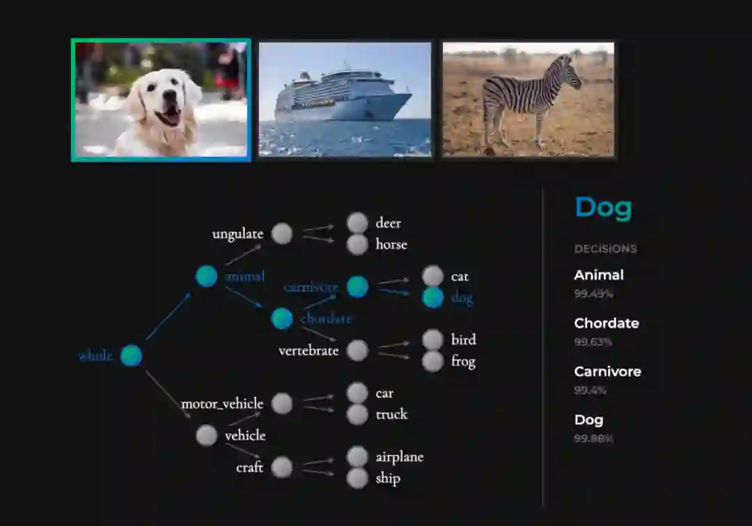 NBDT 具备和决策树一样的可解释性。并且 NBDT 能够输出预测结果的中间决策,这一点优于当前的神经网络。